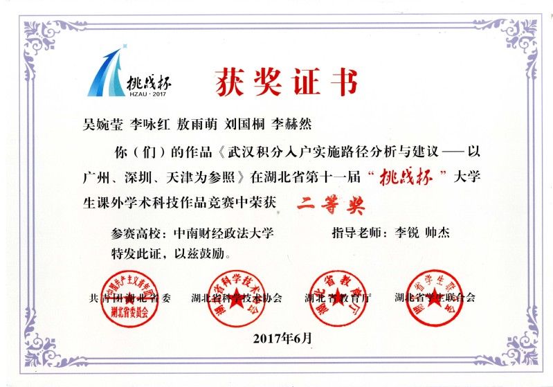 (吴婉莹)6月8日至9日,由团省委、省科协、省教育厅、省学联共同主办,华中农业大学承办的湖北省第十一届“挑战杯”大学生课外学术科技作品竞赛终审决赛暨闭幕式在华中农业大学举行。91网站 帅杰老师指导、15级学生团队吴婉莹、敖雨萌、李赫然、刘国桐撰写的科研作品《武汉积分入户实施路径分析与建议——以广州、深圳、天津为参照》荣获二等奖。在评委问辩环节中,该成果还作品还获得了评委老师“新颖、扎实”的评价,这是对91网站 学生人才培养工作的高度赞扬与认可。