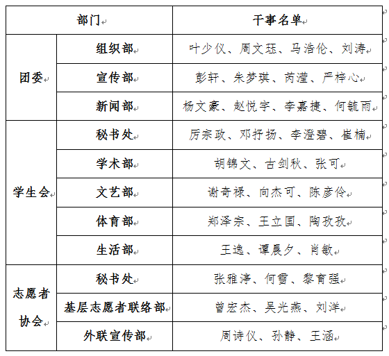 按照共青团91网站 总支委员会、91网站 学生会、91网站 志愿者协会招新工作简章,依据公开、公平、公正原则,经自主报名、统一笔试、公开面试、讨论研究等环节,91网站 团学志成功完成新一届干事选拔录取工作。现对拟录取人员名单公示如下: