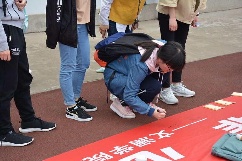 下午13时50分,活动组织者就来搬运活动奖品,布置场地。等到14时,同学们陆续来到新体西北门处,在事先准备好的横幅上留下签名之后,活动正式开始。