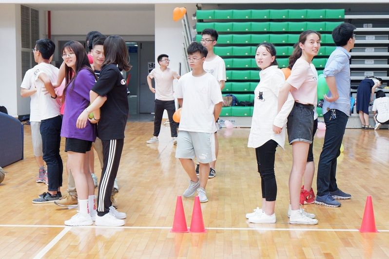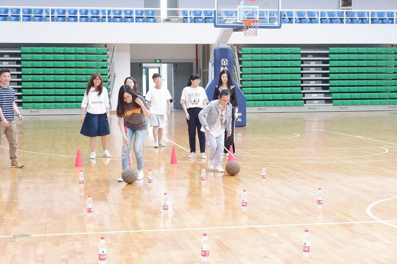 比赛选手一共分为六组。他们分别为由陈泰良老师带领的一队,帅杰老师带领的二队,余利老师带领的三队,吴雷老师带领的四队,莫婷婷老师带领的五队以及祖宝璐老师带领的六队。第一场比赛叫做木棍推篮球,比赛需要每一队成员用木棍推着篮球前进一段距离,木棍不可离开球面,速度快者获胜。随着一声哨响,选手们都全力以赴,奔跑在赛道上,加油声助威声不绝于耳。老师们也不同于课上的严肃认真,积极在赛道边与学生们互动,赛场上充满了快乐的气氛。