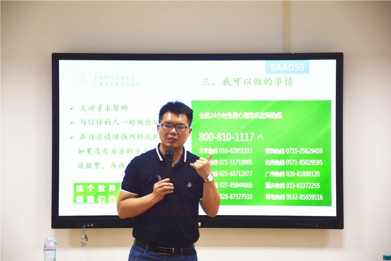 接下来,余老师对各位寝室长介绍了发生“自杀”行为的预兆,以及如何更好地应对。他指出,当周围同学发生“自杀”言论时,更多是一种想要引起关注的求助行为,这时,绝不能说出鼓励其自杀的话语,而应该及时向专业人士咨询,鼓励并且安抚该同学的情绪,以防发生意外。