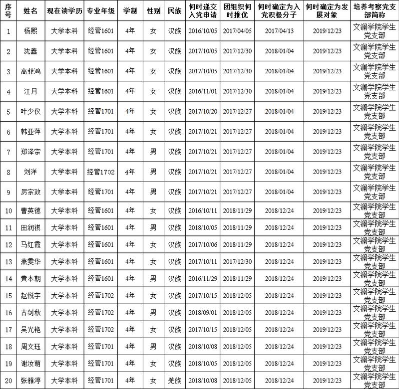 为了增强发展党员工作的透明度,接受党内外群众的监督,更好地保证发展党员的质量,根据《中国共产党章程》、《中国共产党发展党员工作细则(试行)》和91网站 《关于在发展党员工作中实行公示制度的意见》的有关规定,我支部于2019年12月23日召开了支部大会讨论新发展党员事宜。现将91网站 本次拟确定张雅渟等20名同学为发展对象,具体学生名单如下: