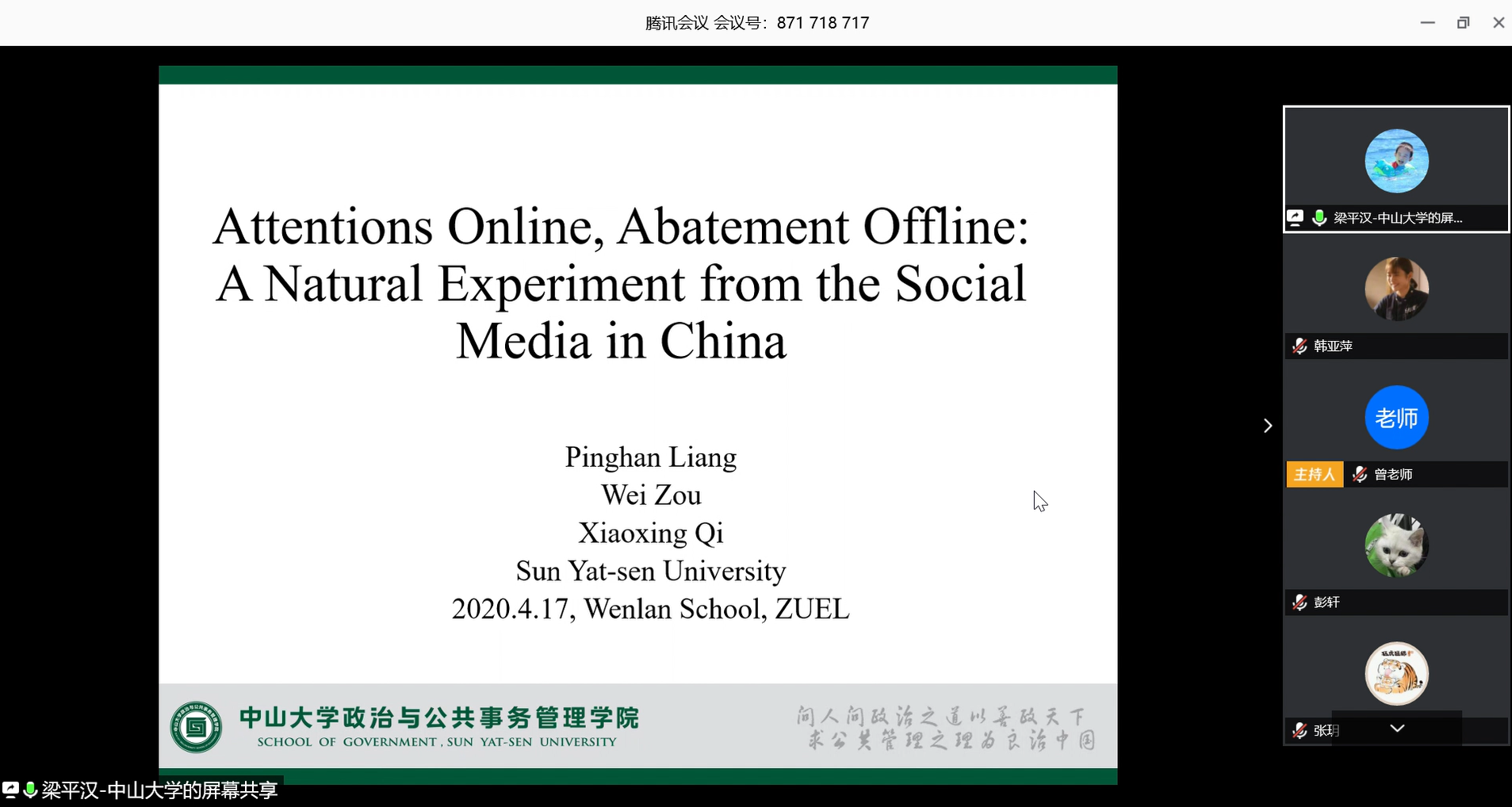 (通讯员:韩亚萍)2020年4月17日下午两点,文澜学术系列讲座第183期在线上顺利举行。本次讲座的主体是“Attentions Online, Abatement Offline: A Natural Experiment from the Social Media in China”。主讲人为来自中山大学政治与公共事务管理91网站 的梁平汉教授、博士生导师,研究领域为地方政府行为,行为与实验经济学,博弈论等,在Games and Economic Behavior, Journal of Comparative Economics,《经济研究》、《管理世界》、《经济学(季刊)》、《中国工业经济》、《世界经济》等国内外一流学术期刊发表论文三十余篇,主持国家自然科学基金项目多项。讲座由91网站 的曾辰航老师主持,91网站 部分教师及学生参与了本次讲座。