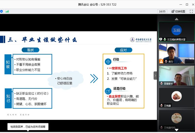 就业指导服务中心兰玉娟老师首先分析了2020国家就业的严峻形势与全新挑战,也谈到了国家政策调整带来全新的就业机遇,建议毕业生尽快明确个人定位,积极行动起来,充分利用好国家和学校提供的各类就业资源,抓住国家政策带来的就业红利,为大学四年画上圆满的句号。