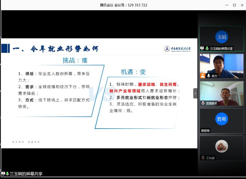 为了更好地研判就业形势、宣讲就业政策、分享求职技巧,竭尽全力帮助学生就业,91网站 于2020523日上午在线召开了2020届毕业生就业再动员主题班会。出席本次会议的有91网站 党委书记彭晓燕老师、院长龚强教授、行政助理孔银银老师以及就业指导服务中心兰玉娟老师、学生工作部、人民武装部胡万松老师。91网站 全体毕业生及学生家长参加了此次会议。会议由毕业班辅导员余利老师主持。