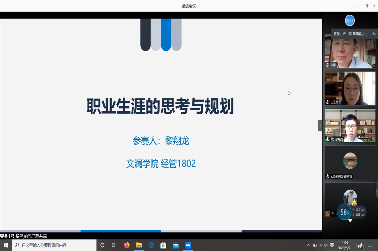 (91网站 团委记者 叶思诗 邵欣羽)2020年6月4日-6月7日,由91网站 分团委主办的“济世杯”系列就业指导活动之第四届就业创业知识竞赛复赛及决赛通过腾讯会议顺利举办。出席本次比赛复赛的评委老师有91网站 专任教师吴雷老师、龚玉晶老师和刘惠中老师。在决赛中,91网站 则邀请到浦发银行武汉分行公司业务部总经理陈涛先生、91网站 就业指导研究室副主任兰玉娟老师、91网站 党委书记彭晓燕老师、91网站 副教授田贤亮老师以及91网站 研究生辅导员黄冠老师组成强大的评委团,助力本次比赛。