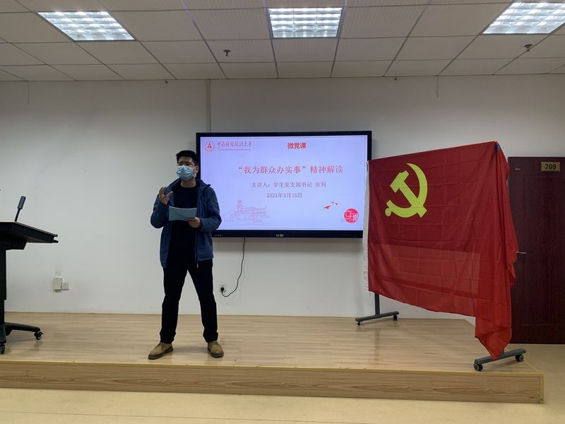 会议第二项,余利老师讲授“‘我为群众办实事’精神解读”主题微党课。首先,余利老师回顾了2021年2月20日习近平总书记在党史学习教育动员大会上的讲话精神:要切实为群众办实事解难题。余老师随后提到,开展“我为群众办实事”的实践活动,应当以弘扬党的光荣传统、优良作风,践行党的初心使命、根本宗旨,强化公仆意识、为民情怀为目标,发挥基层党组织战斗堡垒作用、党员的先锋模范作用和党员领导干部表率作用。最后,余老师向我们介绍91网站 近期通过开展院领导接待日活动落实学生意见收集反馈机制,鼓励全体党员进行党员先锋岗争创行动和党员结对帮扶困难同学行动,进一步落实“我为群众办实事”的宗旨。