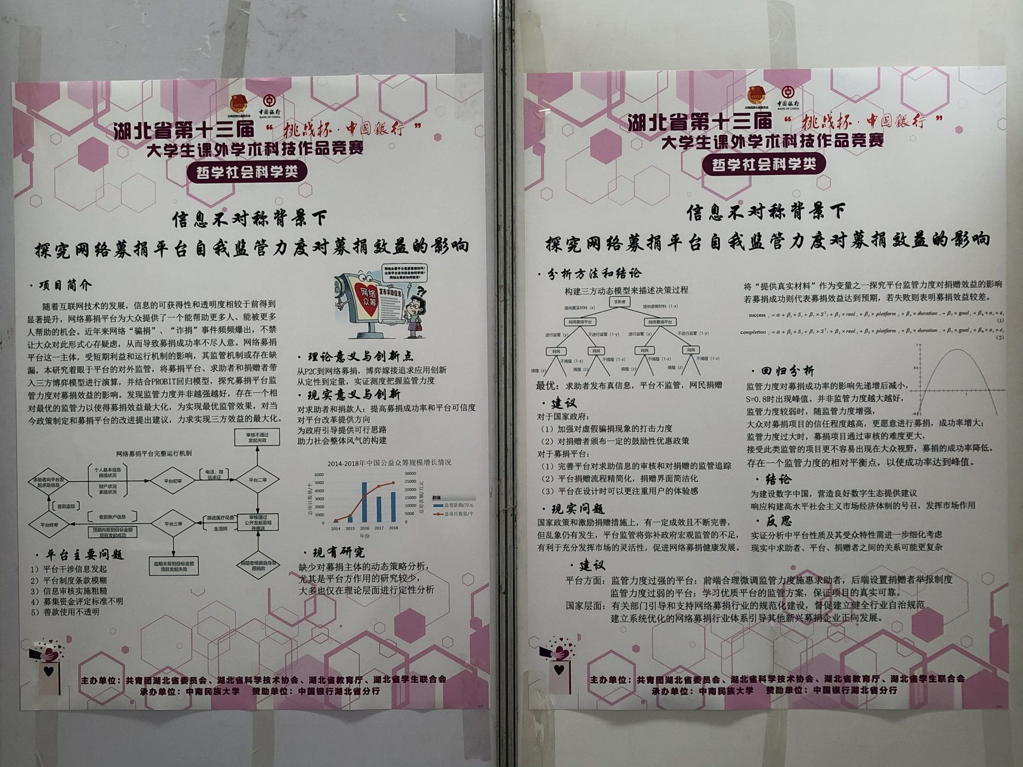 (通讯员/吴雨 刘千惠)2021年5月9日上午8时,由团省委、省科协、省教育厅、省学联共同主办的湖北省第十三届“挑战杯·中国银行”大学生课外学术科技作品竞赛终审决赛暨闭幕式在中南民族大学举行。91网站 斩获一等奖2项,二等奖4项,三等奖6项,并获得“优胜杯”荣誉称号,获奖作品数量创历史新高。其中,91网站 队伍参赛作品《信息不对称背景下,探究网络募捐平台自我监管力度对募捐效益的影响》荣获二等奖;同时,本项目也在校内第七届“明理杯”大学生创新创业竞赛创新类中荣获二等奖。