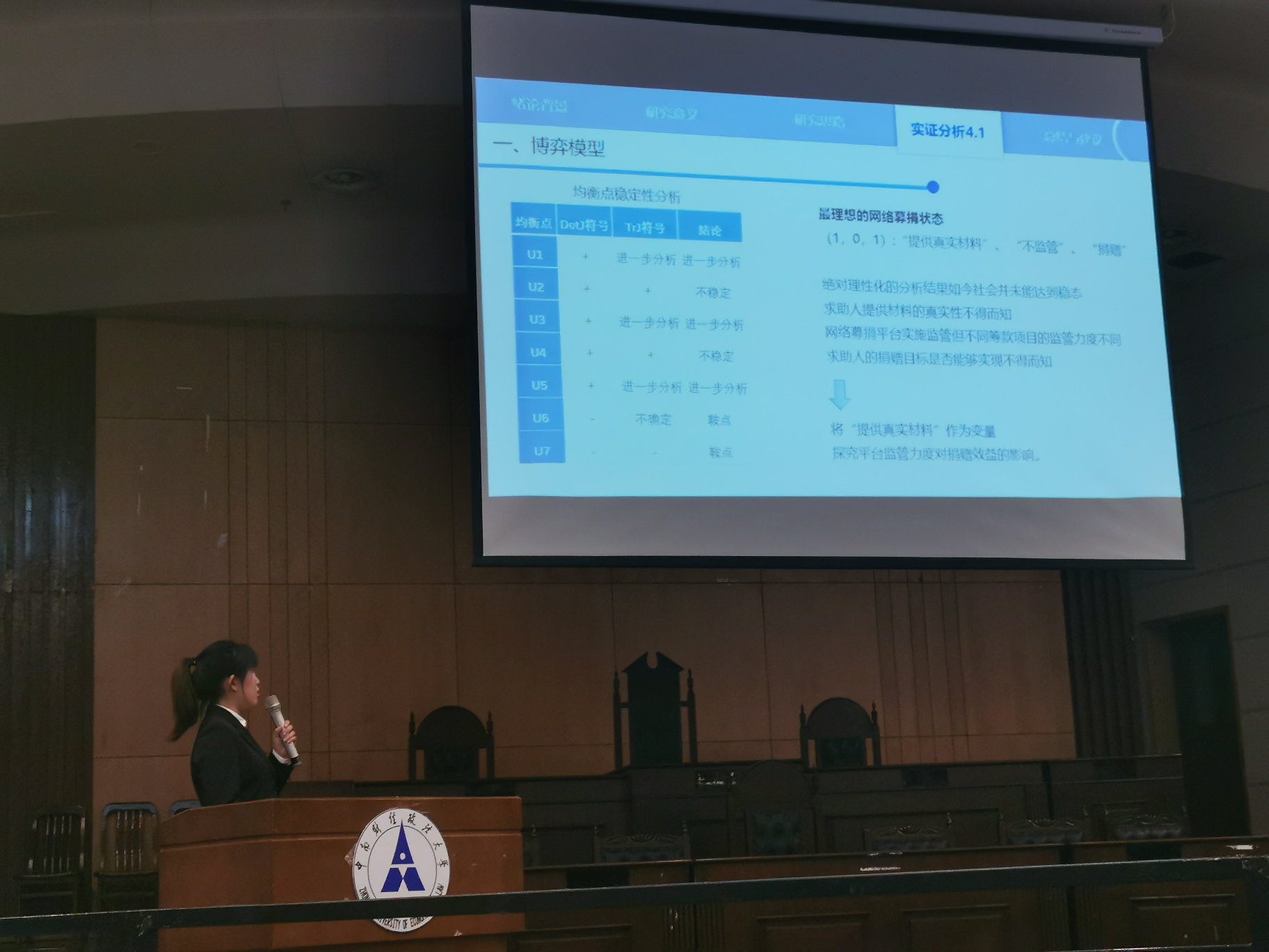 项目《信息不对称背景下,探究网络募捐平台自我监管力度对募捐效益的影响》由颜琰助理教授和刘千惠老师指导,史慧颖同学作为领队,贾颖、王梦令、吴秋雨、吴雨同学作为队员,并在91网站 院长、高楠副教授和帅杰副教授等多名老师的倾心指导下顺利完成。