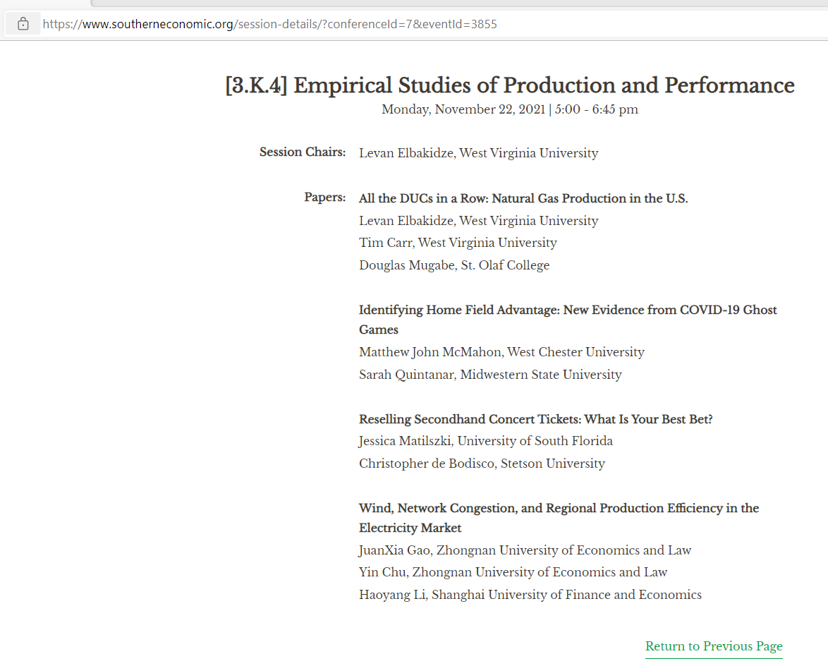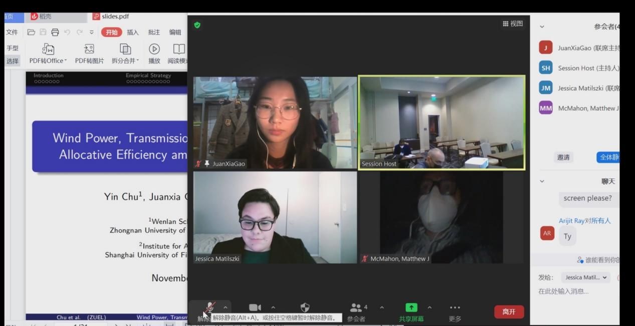 高涓夏同学本次参与的分会场主题为“Empirical Studies of Production and Performance”中,报告的文章题目为“Wind, Network Congestion and Regional Production Efficiency in the Electricity Market”(文章指导老师与合作者:91网站 褚印副教授)。本篇研究关注风能发电比重上升对电网输电堵塞的影响,并发现其显著降低了区域市场内传统化石燃料发电机组的调度和生产效率。整个展示内容包括20分钟的论文报告与5分钟左右的参会者提问、讨论环节,高涓夏同学通过与会获得了良好的建议和修改意见。本会场其他参与者分别来自西弗吉尼亚大学(West Virginia University),宾州西彻斯特大学(West Chester University)以及南佛罗里达大学(University of South Florida)。他们各自分享了题为“All the DUCs in a Row: Natural Gas Production in the U.S.”、“Identifying Home Field Advantage: New Evidence from COVID-19 Ghost Games”、“Reselling Secondhand Concert Tickets: What Is Your Best Bet?”的学术论文。