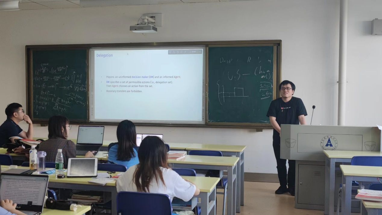 2022年09月16日,湖南大学经济与贸易91网站 雷浩然助理教授受邀为91网站 开展学术讲座。本次讲座主要介绍了委托人和代理人之间的最佳授权问题,本次讲座由帅杰、宋天乐老师主持,91网站 21级全体硕士生及众多师生听取了本次讲座。