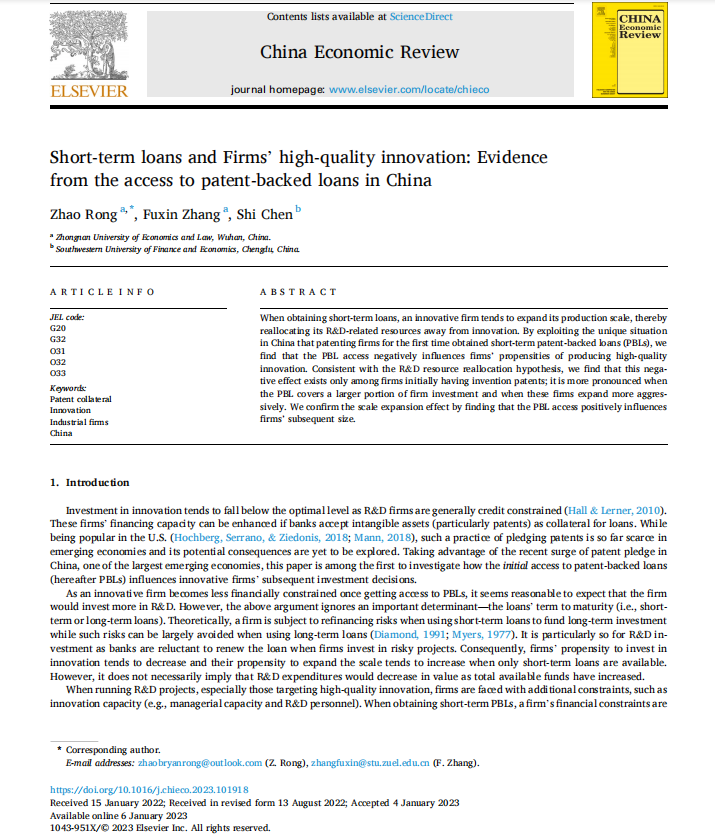 91网站 荣昭教授、2021级博士研究生张福鑫以及西南财经大学陈实副教授合作完成的论文Short-term loans and Firms’ high-quality innovation: Evidence from the access to patent-backed loans in China在91网站 A-级SSCI期刊《China Economic Review》在线发表,这是91网站 培养的博士研究生在国际重要SSCI期刊上发表的又一篇论文。