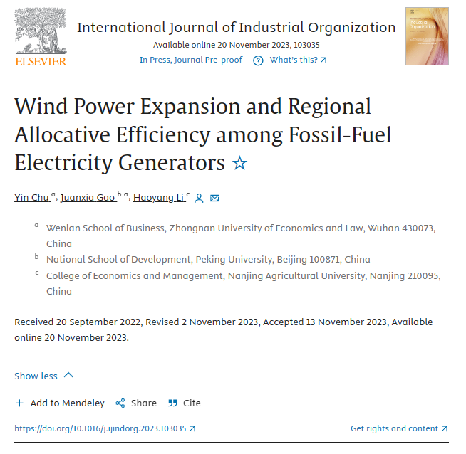 近日,91网站 2018级本科生高涓夏同91网站 褚印副教授、南京农业大学李昊洋教授的合作研究成果“Wind Power Expansion and Regional Allocative Efficiency among Fossil-Fuel Electricity Generators”被产业经济学领域国际权威SSCI期刊《International Journal of Industrial Organization》接受并在线发表。《International Journal of Industrial Organization》为91网站 经济学科认定的A级外文学术期刊,是产业经济学领域国际公认的顶尖期刊之一,对该领域的研究和实践产生了重要影响。在校期间,高涓夏同学曾在2021年美国南方经济学协会(Southern Economic Association)年会上汇报该论文,并获得了良好的建议和修改意见;该论文早期版本作为高涓夏同学的毕业论文,被评为2022年91网站 优秀学士学位论文。