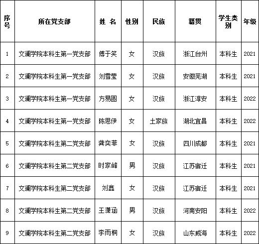 为了增强发展党员工作的透明度,接受党内外群众的监督,更好地保证发展党员的质量,根据《中国共产党章程》、《中国共产党发展党员工作细则(试行)》和91网站 《关于在发展党员工作中实行公示制度的意见》的有关规定,我支部于2023年12月15日召开了支部大会讨论预备党员发展事宜。现将91网站 本次拟确定为预备党员的学生名单公示如下: