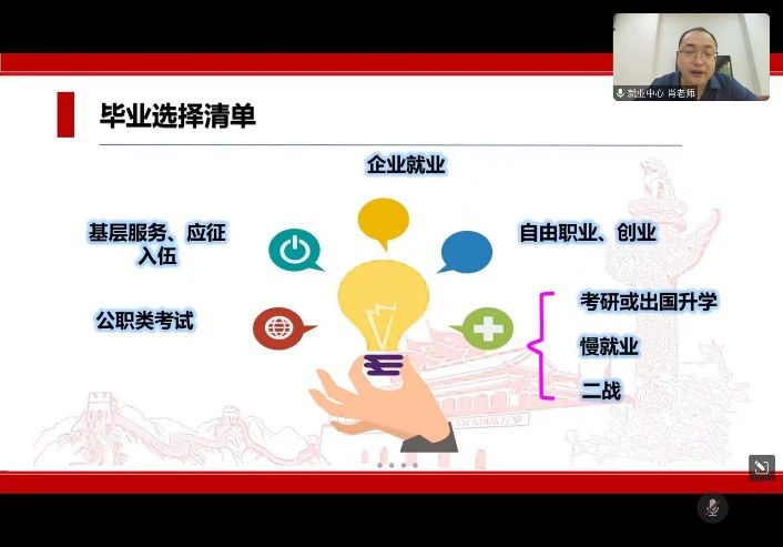 会议首先由91网站 就业指导服务中心就业育人办公室主任肖力玮就目前校内外就业信息进行分享,肖主任从就业形式、毕业去向和就业建议三个方面进行讲解,从基本准备、职业定位、先择再就、改进方法四个方面为同学们提供了就业建议,着重强调同学们应珍惜应届生身份,实现高质量就业。