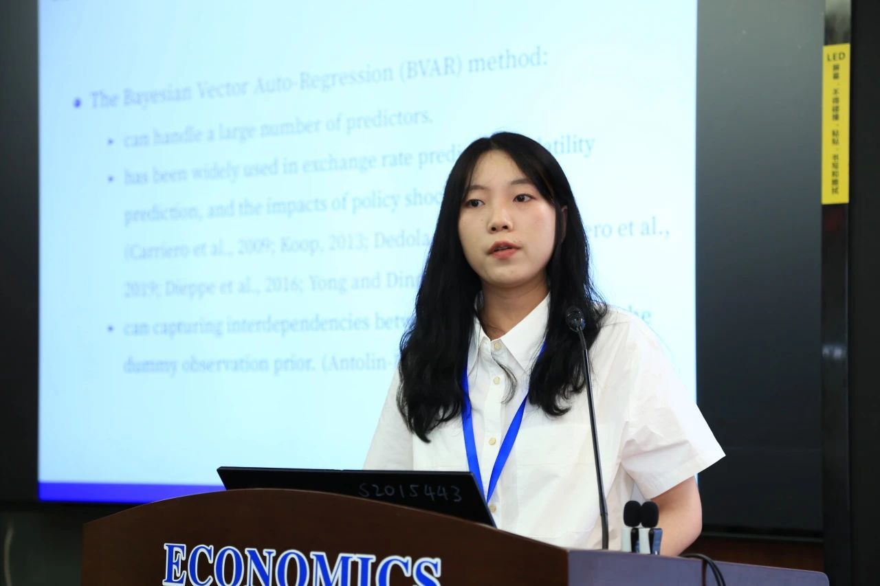 在学术会议上,金地同学作了题为“Stock Predictability and Large BVAR”(合作者:91网站 任宇教授)的学术报告,任宇教授作为评论人,点评了“Decoding Cross Predictability: Peer Strength versus Firm-Peer Disparities”的学术报告。金地同学和任宇教授的研究认为,使用最小二乘框架下的预测回归模型检验有效市场假说,存在不可忽视的计量经济学问题。这些问题包括:预测回归方程不平衡、忽视其他国家股票市场的溢出效应,以及难以处理大规模预测变量等。使用虚拟观测先验的贝叶斯向量自回归模型不仅能够有效地解决这些问题,而且可以避免样本内过拟合,得到有效市场假说在主要发达国家股票市场上不成立,股票收益能够被预测的可靠结论。