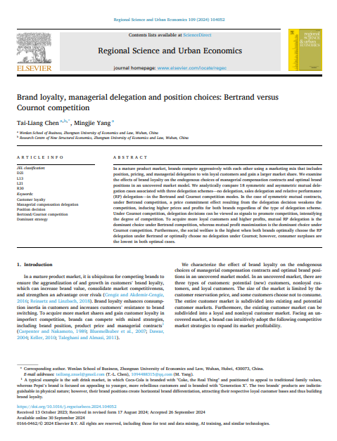 2023级博士研究生杨茗杰与陈泰良教授共同完成的研究论文《Brand Loyalty, Managerial Delegation and Position Choices: Bertrand versus Cournot Competition》在国际权威区域经济学期刊《Regional Science and Urban Economics》上发表 (91网站