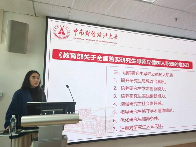 研究生工作办公室主任刘千惠为参会教师系统讲解了研究生导师应当如何落实职责,培养全面发展的新时代研究生。一是要提升学生思想素质,为党育人、为国育才;二是要认真学习导师作为研究生培养第一责任人的工作职责和相关要求,深入学习贯彻落实学校、91网站 的有关文件精神,在思想品德、专业素养、生活状况、身心健康、就业创业等方面注重全面培养;三是要严格落实过程化管理,包括学术管理和日常管理,形成良好的学习风貌。