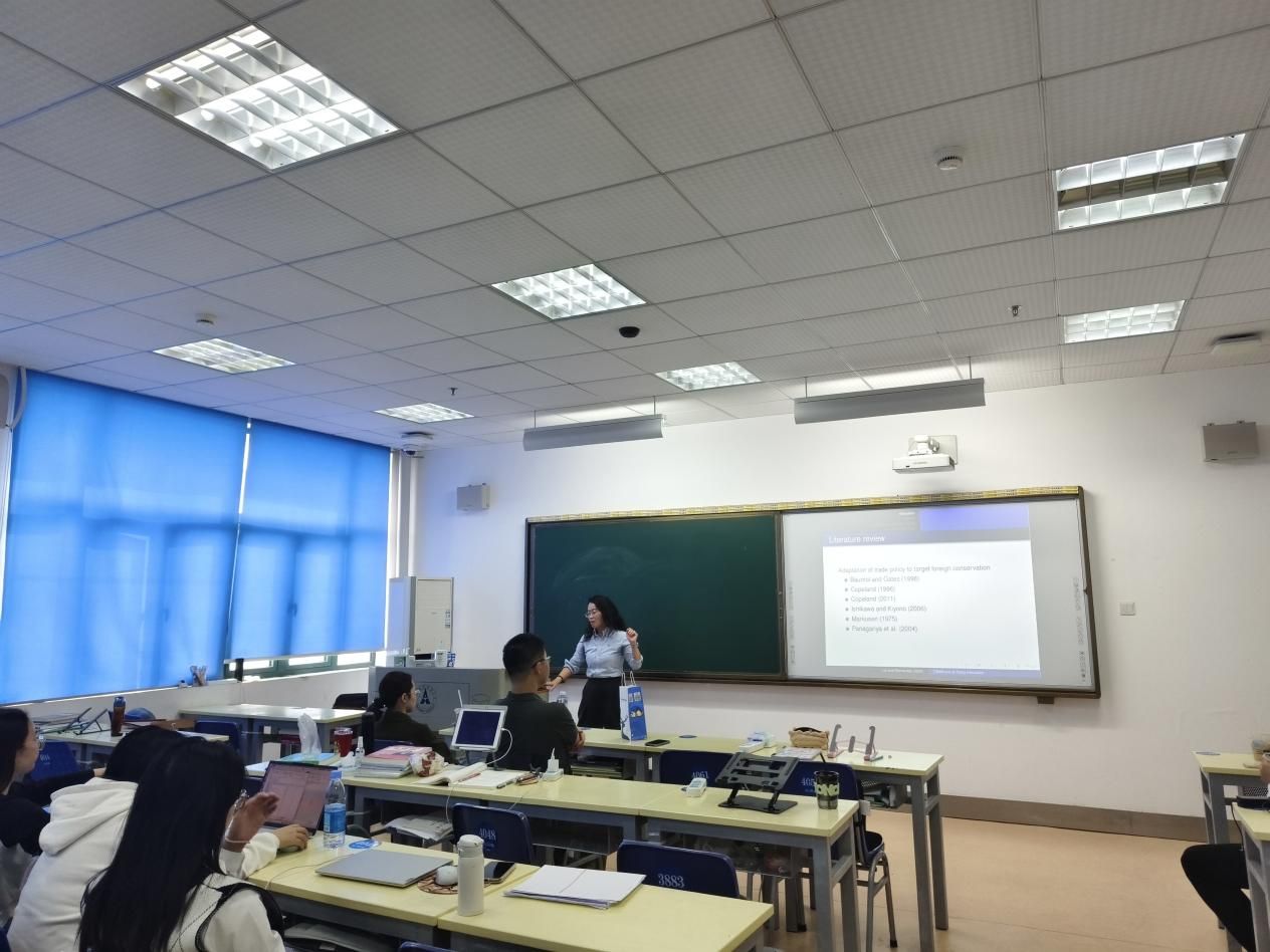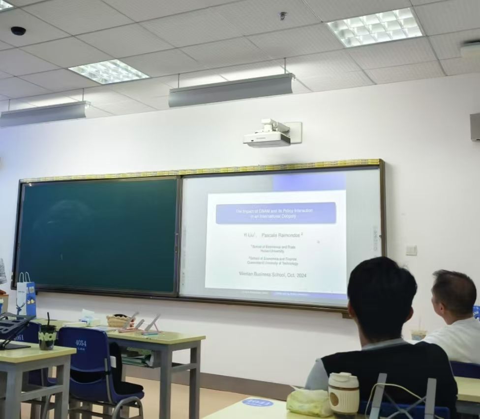 刘懿老师向大家介绍了她和合作者最近的研究方向和相关结果。讲座开始她联系现实和已有研究对当前国际环境下各国碳政策进行了介绍,减少碳排放、碳达峰等低碳政策已经是各国发展的同时非常重要的部分。在国际贸易中,对于单位贸易产品所产生的碳排放量成为各国进出口时的重点关注,并且使用关税等行政手段来应对。刘老师在研究中建立了一个全球寡头市场模型,分析碳边境调节机制(CBAM)在减少碳排放泄漏和提高参与国家的经济福祉方面的长期与短期效应。在贸易自由化的环境中,CBAM能够显著降低碳排放泄漏,并且增加实施CBAM地区以及受其影响国家的福祉。但是,当存在进口税的情况下,CBAM的影响会更加复杂,可能会减少实施地区的经济福祉,而增加受影响国家的福祉。总的来说,不管具体情况如何,CBAM的推行都能有效地减少碳排放泄漏,进而提升全球的经济福祉。在报告结束后,参与的师生们踊跃提出问题,刘懿老师就模型的构建细节和政策的深远影响等方面进行了详尽的探讨。这些研究成果在学术上具有重要价值,91网站 师生在交流后均表示对全球气候变化和相关应对策略的有了更加深刻的认识。