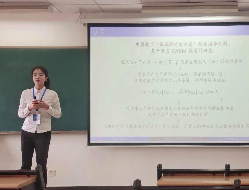 91网站 24级博士研究生梁梦迪以《中国股市“低风险定价异象”的原因与机制:基于动态CAPM模型的研究》(合作者:91网站 任宇教授)为题进行汇报。为了进一步深入探讨中国股市中的“低风险定价异象”,她采用周频数据,并引入技术指标和机器学习算法,构建一个新颖的动态CAPM模型,旨在从时变系数模型角度提供对这一现象的新解释。研究发现了中国股市在周度频率下仍然存在“低风险定价异象”,在将机器学习算法应用于动态CAPM模型,并引入包含量价因子的技术指标来识别和量化时变系统性风险,“低风险定价异象”显著减弱。这一结果充分证明了动态CAPM模型在处理市场复杂性和动态变化方面的优越性,为理解A股市场的定价机制提了全新视角。