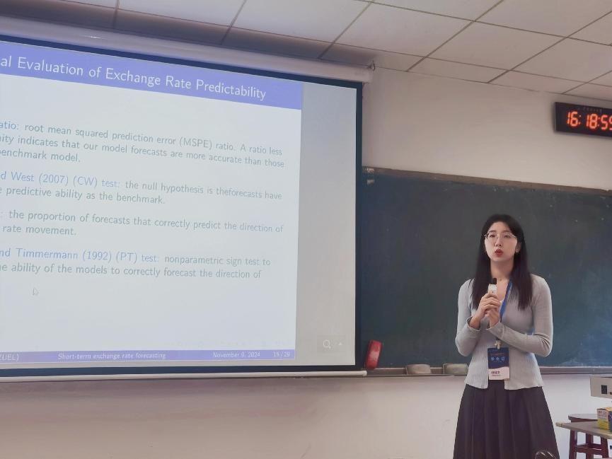 在分会场报告中,91网站 23级博士研究生任佳文作了题为《基于技术指标和经济基本面的短期汇率预测》的学术报告(合作者:91网站 任宇教授)。她的研究提出在方程系数模型的框架下,结合技术指标和宏观经济变量的信息,可以生成可靠的样本外汇率预测。为了避免样本内估计的过拟合问题,她采用了Elastic-Net方法,减少信息量较低的预测变量对样本外预测的影响,从而提高预测性能。实证结果表明,这一方法在提前一个月预测中显著优于随机游走和其他替代方法,且技术指标和经济基本面在预测中都起到了重要作用。此外,根据他们的预测,通过货币和债券交易获得了显著的投资收益。