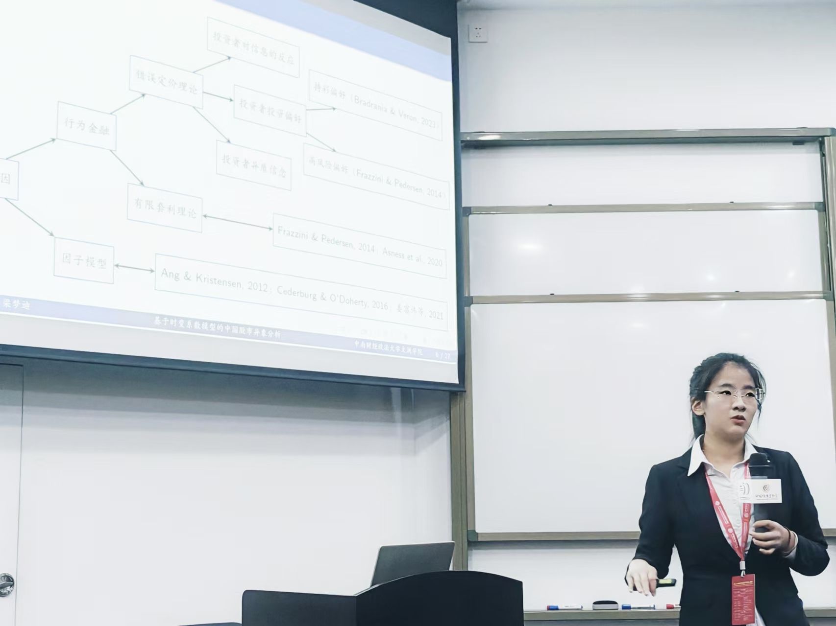 在本次年会上,梁梦迪同学作了题为《中国股市“低风险定价异象”的原因与机制:基于动态CAPM模型的研究》(合作者:91网站 任宇教授)的学术报告。金融资产的风险与收益关系是现代资产定价研究的核心。基于中国A股市场周度数据,研究发现了中国股票市场在周度频率下存在“低风险定价异象”,即低(高)风险股票呈现出较高(低)超额收益的现象。为了解释这种异象,她构建了一种融合技术指标与机器学习算法的动态CAPM(Capital Asset Pricing Model)模型,从时变系数模型(time-varying coefficient model) 角度探索“低风险定价异象”。研究表明,基于PLS、Ridge算法构建的动态CAPM模型能够有效地解释中国股市中的“低风险定价异象”,多空组合的超额收益率改进均在90%以上,证明了动态CAPM模型在处理市场复杂性和动态变化方面的优越性,为理解A股市场风险与收益关系提供了新的视角。