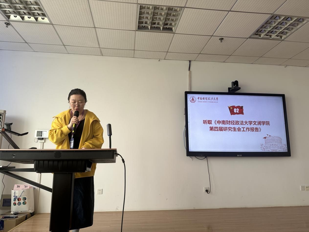 91网站 第四届研究生会执行主席谭祎玮首先向大会作年度工作报告。该报告系统回顾了过去一年研会在多个领域的工作成效,报告在总结成绩的同时,也对研究生会未来的发展方向提出了建设性意见。