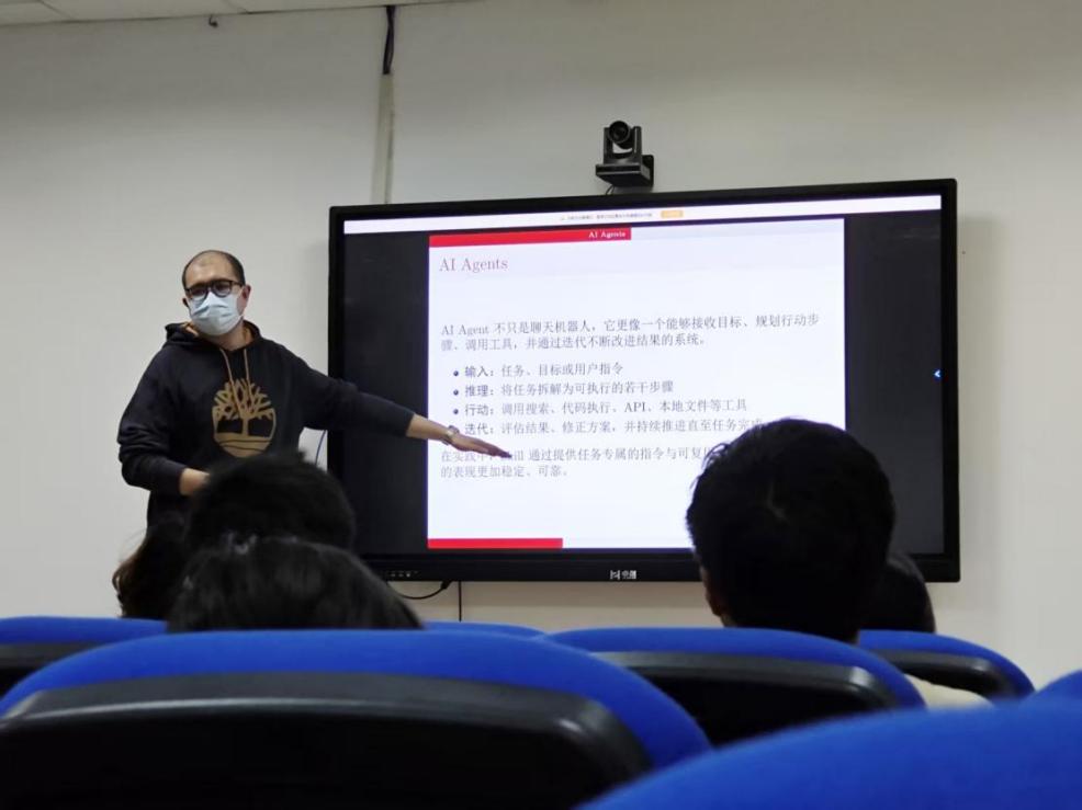 专题分享会中,杨子超老师围绕人工智能辅助科研与学习进行讲解,介绍了豆包、DeepSeek、ChatGPT、Gemini等大语言模型的特点及使用成本,并结合实际场景,系统讲解基础对话、本地部署、API调用、AI Agents等应用方式。通过文本分析、自动化处理等案例,杨老师帮助同学们更直观地理解人工智能在学习科研中的应用价值。